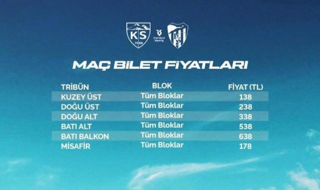 Süper Lig’in 21. Haftasında Kayserispor sahasında Kocaelispor’u ağırlayacak. Zorlu maçın bilet fiyatları belli oldu. Maçta en ucuz bilet 138 TL olurken, en yüksek bilet fiyatı ise 638 TL olarak açıklandı. Misafir seyircilerin 178 TL’den seyredeceği maç pazartesi günü saat 17.00’da oynanacak. Maçın bilet fiyatları şu şekilde: